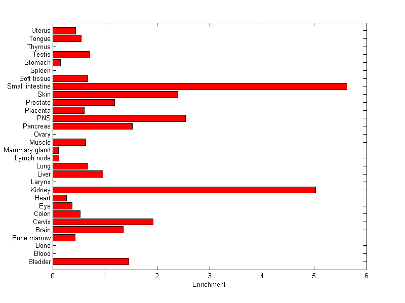 The expression level is normalized with tissue-library size. Each value for a gene in a tissue is a ratio of observed ESTs to the expected one in this tissue. The expected number of ESTs is the product of total ESTs of the gene and the fraction of total ESTs in the tissue among all ESTs in 30 tissues.