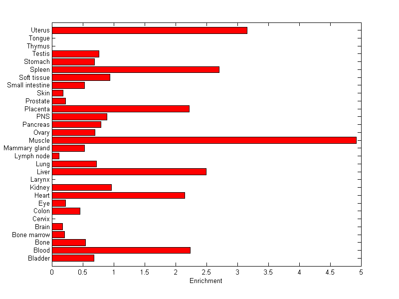 The expression level is normalized with tissue-library size. Each value for a gene in a tissue is a ratio of observed ESTs to the expected one in this tissue. The expected number of ESTs is the product of total ESTs of the gene and the fraction of total ESTs in the tissue among all ESTs in 30 tissues.