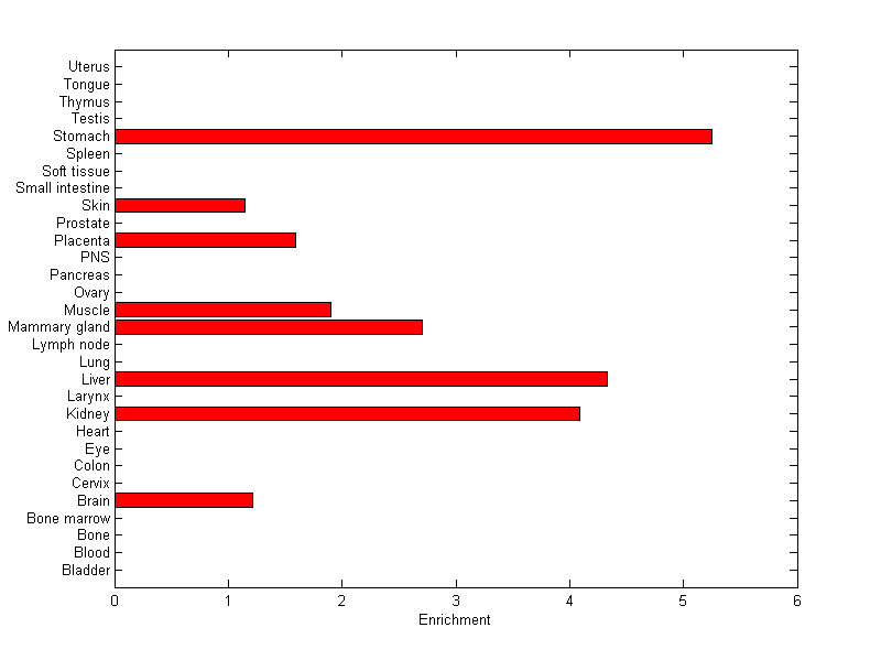The expression level is normalized with tissue-library size. Each value for a gene in a tissue is a ratio of observed ESTs to the expected one in this tissue. The expected number of ESTs is the product of total ESTs of the gene and the fraction of total ESTs in the tissue among all ESTs in 30 tissues.