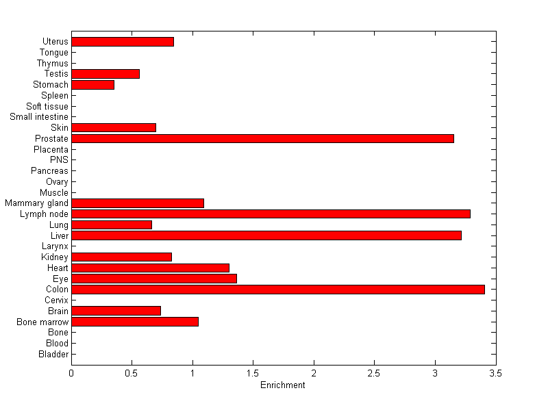 The expression level is normalized with tissue-library size. Each value for a gene in a tissue is a ratio of observed ESTs to the expected one in this tissue. The expected number of ESTs is the product of total ESTs of the gene and the fraction of total ESTs in the tissue among all ESTs in 30 tissues.