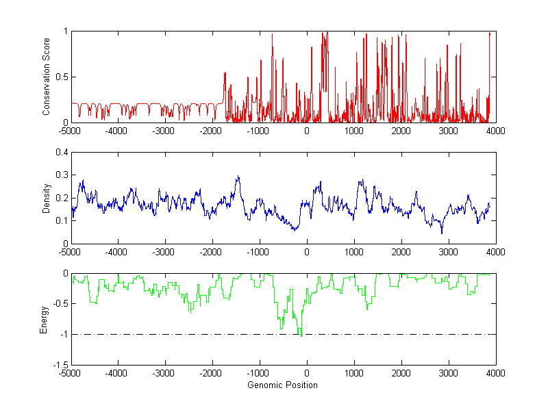 About the profiles: The conservation profile (red curve) is about conservation scores of the promoter sequences. Conservation was determined from an eight-way alignment of human, chimpanzee, dog, mouse, rat, chicken, zebrafish and fugu sequences. The conservation was quantified by a conservation score between 0 and 1, with 1 as highest conservation. The conservation score was obtained from UCSC genome databases. The density profile (blue curve) is about density of all TF binding sites. The energy profile (green curve) is about energy for module detection based on TF interaction. The positions with energy less than -1 indicate the existence of CRMs. Download: Conservation profileDensity profile Energy profile CRM summary |
