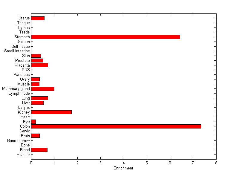 About the profile: The expression level is normalized with tissue-library size. Each value for a gene in a tissue is a ratio of observed ESTs to the expected one in this tissue. The expected number of ESTs is the product of total ESTs of the gene and the fraction of total ESTs in the tissue among all ESTs in 30 tissues. Summary: This gene is preferentially expressed in [colon, stomach] Download: |