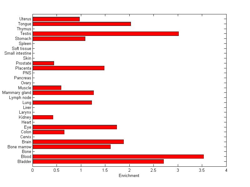 The expression level is normalized with tissue-library size. Each value for a gene in a tissue is a ratio of observed ESTs to the expected one in this tissue. The expected number of ESTs is the product of total ESTs of the gene and the fraction of total ESTs in the tissue among all ESTs in 30 tissues.