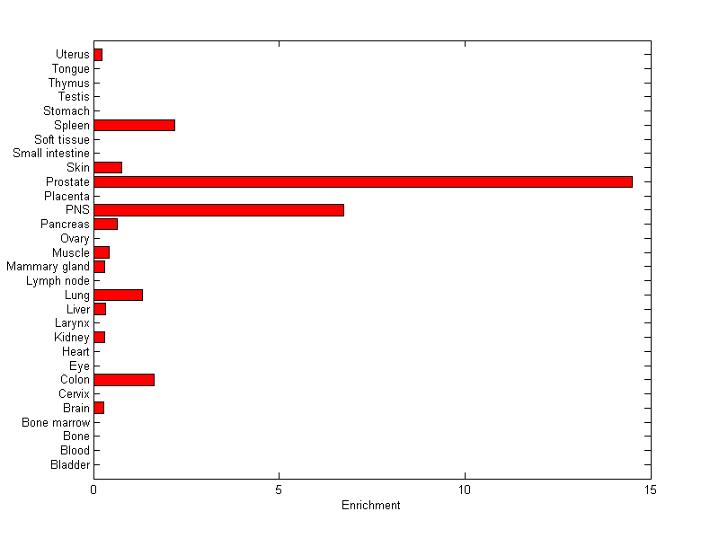 The expression level is normalized with tissue-library size. Each value for a gene in a tissue is a ratio of observed ESTs to the expected one in this tissue. The expected number of ESTs is the product of total ESTs of the gene and the fraction of total ESTs in the tissue among all ESTs in 30 tissues.