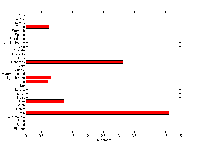 The expression level is normalized with tissue-library size. Each value for a gene in a tissue is a ratio of observed ESTs to the expected one in this tissue. The expected number of ESTs is the product of total ESTs of the gene and the fraction of total ESTs in the tissue among all ESTs in 30 tissues.