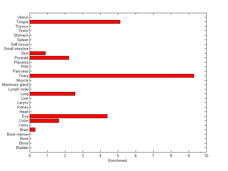 The expression level is normalized with tissue-library size. Each value for a gene in a tissue is a ratio of observed ESTs to the expected one in this tissue. The expected number of ESTs is the product of total ESTs of the gene and the fraction of total ESTs in the tissue among all ESTs in 30 tissues.