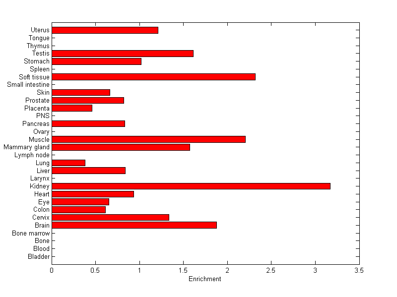 The expression level is normalized with tissue-library size. Each value for a gene in a tissue is a ratio of observed ESTs to the expected one in this tissue. The expected number of ESTs is the product of total ESTs of the gene and the fraction of total ESTs in the tissue among all ESTs in 30 tissues.