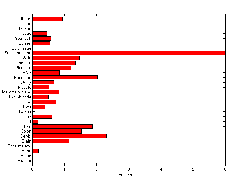 About the profile: The expression level is normalized with tissue-library size. Each value for a gene in a tissue is a ratio of observed ESTs to the expected one in this tissue. The expected number of ESTs is the product of total ESTs of the gene and the fraction of total ESTs in the tissue among all ESTs in 30 tissues. Summary: This gene is preferentially expressed in [small_intestine] Download: |