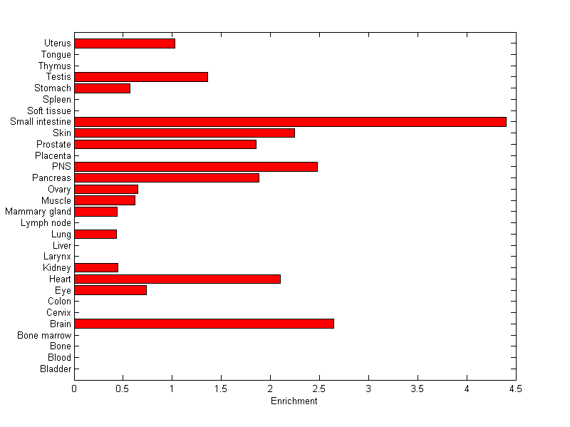 The expression level is normalized with tissue-library size. Each value for a gene in a tissue is a ratio of observed ESTs to the expected one in this tissue. The expected number of ESTs is the product of total ESTs of the gene and the fraction of total ESTs in the tissue among all ESTs in 30 tissues.