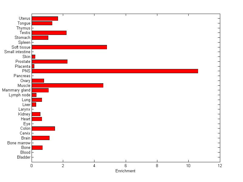 The expression level is normalized with tissue-library size. Each value for a gene in a tissue is a ratio of observed ESTs to the expected one in this tissue. The expected number of ESTs is the product of total ESTs of the gene and the fraction of total ESTs in the tissue among all ESTs in 30 tissues.