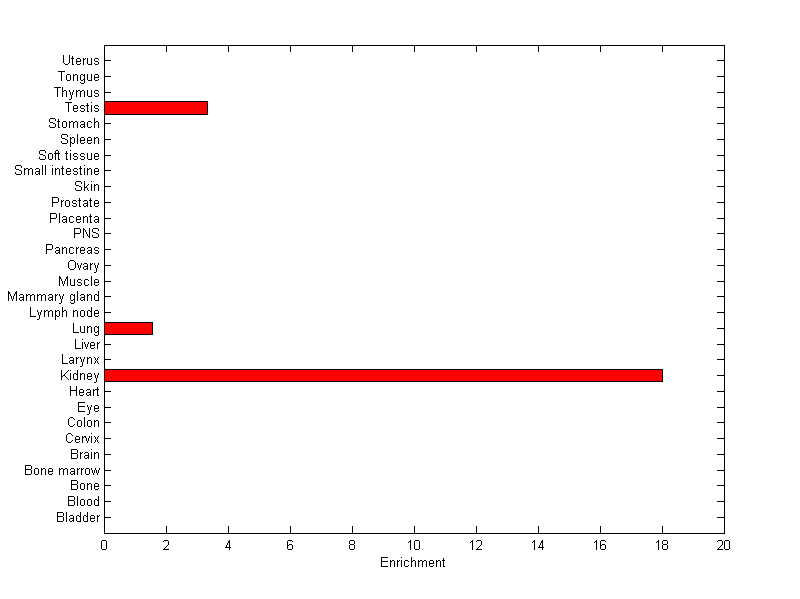 The expression level is normalized with tissue-library size. Each value for a gene in a tissue is a ratio of observed ESTs to the expected one in this tissue. The expected number of ESTs is the product of total ESTs of the gene and the fraction of total ESTs in the tissue among all ESTs in 30 tissues.