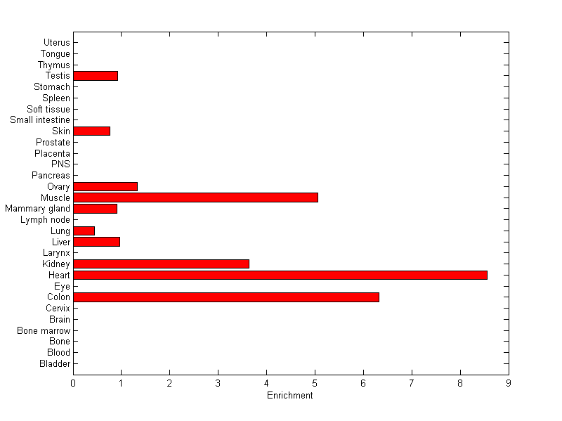 About the profile: The expression level is normalized with tissue-library size. Each value for a gene in a tissue is a ratio of observed ESTs to the expected one in this tissue. The expected number of ESTs is the product of total ESTs of the gene and the fraction of total ESTs in the tissue among all ESTs in 30 tissues. Summary: This gene is preferentially expressed in [colon] Download: |