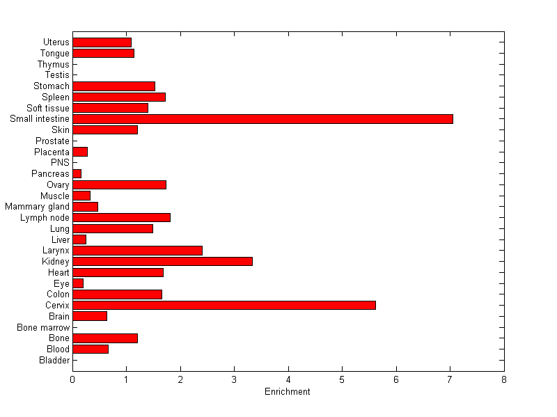 About the profile: The expression level is normalized with tissue-library size. Each value for a gene in a tissue is a ratio of observed ESTs to the expected one in this tissue. The expected number of ESTs is the product of total ESTs of the gene and the fraction of total ESTs in the tissue among all ESTs in 30 tissues. Summary: This gene is preferentially expressed in [cervix] Download: |