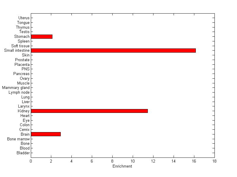 About the profile: The expression level is normalized with tissue-library size. Each value for a gene in a tissue is a ratio of observed ESTs to the expected one in this tissue. The expected number of ESTs is the product of total ESTs of the gene and the fraction of total ESTs in the tissue among all ESTs in 30 tissues. Summary: This gene is preferentially expressed in [kidney] Download: |