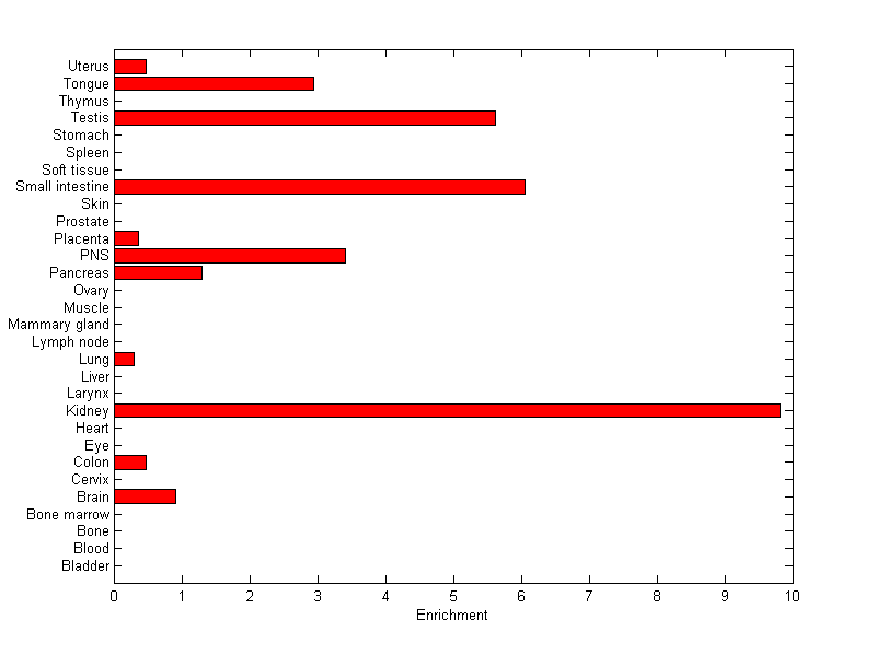About the profile: The expression level is normalized with tissue-library size. Each value for a gene in a tissue is a ratio of observed ESTs to the expected one in this tissue. The expected number of ESTs is the product of total ESTs of the gene and the fraction of total ESTs in the tissue among all ESTs in 30 tissues. Summary: This gene is preferentially expressed in [kidney, testis] Download: |