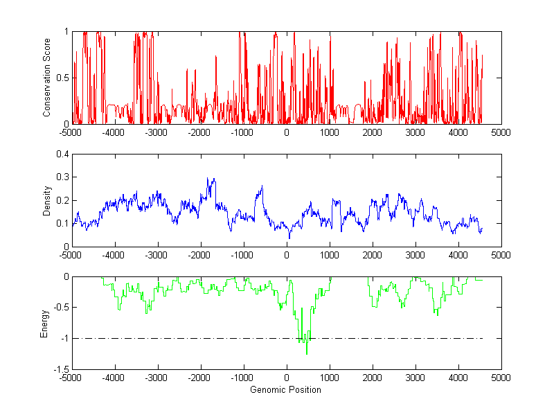The energy profile (green curve) is about energy for module detection based on TF interaction. The positions with energy less than -1 indicate the existence of CRMs.