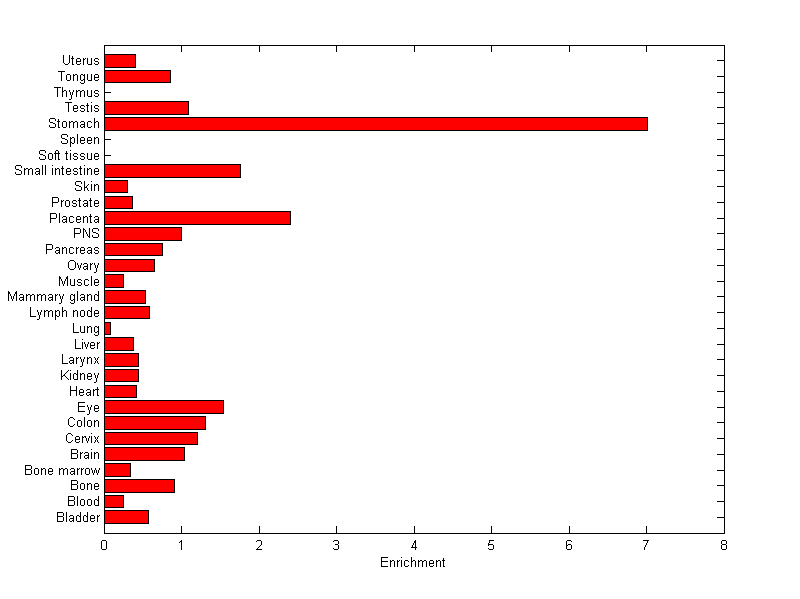 The expression level is normalized with tissue-library size. Each value for a gene in a tissue is a ratio of observed ESTs to the expected one in this tissue. The expected number of ESTs is the product of total ESTs of the gene and the fraction of total ESTs in the tissue among all ESTs in 30 tissues.