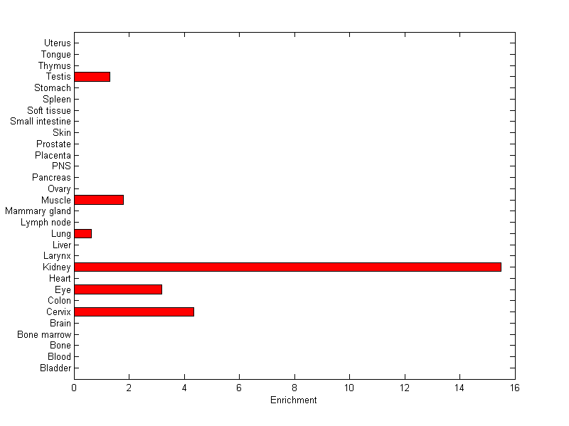 The expression level is normalized with tissue-library size. Each value for a gene in a tissue is a ratio of observed ESTs to the expected one in this tissue. The expected number of ESTs is the product of total ESTs of the gene and the fraction of total ESTs in the tissue among all ESTs in 30 tissues.