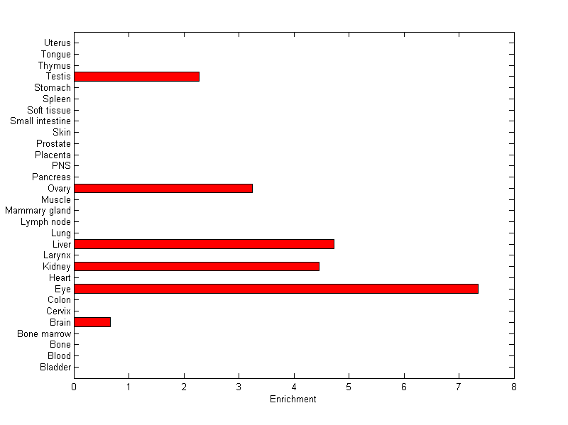 The expression level is normalized with tissue-library size. Each value for a gene in a tissue is a ratio of observed ESTs to the expected one in this tissue. The expected number of ESTs is the product of total ESTs of the gene and the fraction of total ESTs in the tissue among all ESTs in 30 tissues.