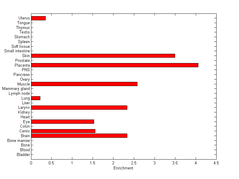 The expression level is normalized with tissue-library size. Each value for a gene in a tissue is a ratio of observed ESTs to the expected one in this tissue. The expected number of ESTs is the product of total ESTs of the gene and the fraction of total ESTs in the tissue among all ESTs in 30 tissues.