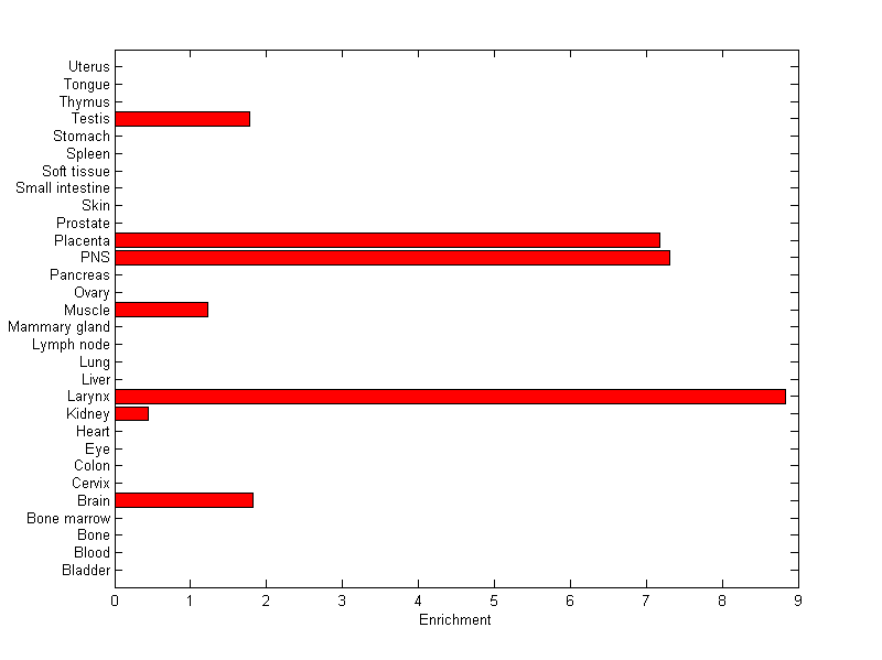 The expression level is normalized with tissue-library size. Each value for a gene in a tissue is a ratio of observed ESTs to the expected one in this tissue. The expected number of ESTs is the product of total ESTs of the gene and the fraction of total ESTs in the tissue among all ESTs in 30 tissues.