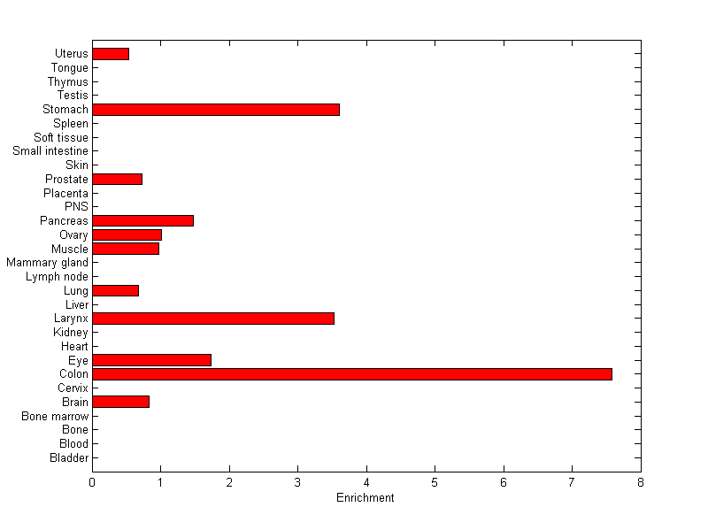 About the profile: The expression level is normalized with tissue-library size. Each value for a gene in a tissue is a ratio of observed ESTs to the expected one in this tissue. The expected number of ESTs is the product of total ESTs of the gene and the fraction of total ESTs in the tissue among all ESTs in 30 tissues. Summary: This gene is preferentially expressed in [colon] Download: |