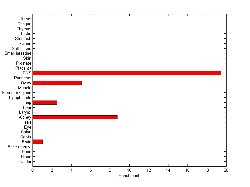 The expression level is normalized with tissue-library size. Each value for a gene in a tissue is a ratio of observed ESTs to the expected one in this tissue. The expected number of ESTs is the product of total ESTs of the gene and the fraction of total ESTs in the tissue among all ESTs in 30 tissues.