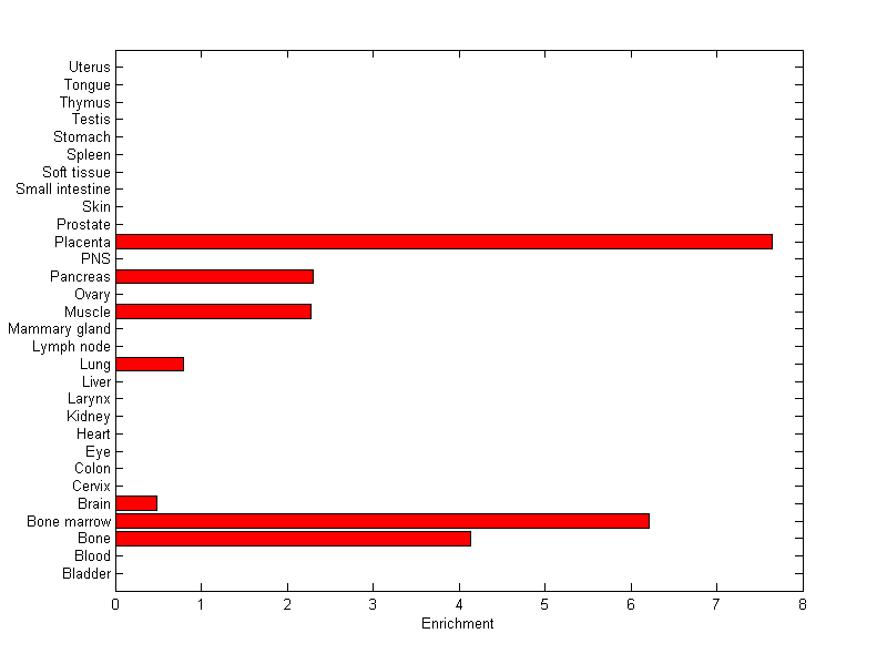 The expression level is normalized with tissue-library size. Each value for a gene in a tissue is a ratio of observed ESTs to the expected one in this tissue. The expected number of ESTs is the product of total ESTs of the gene and the fraction of total ESTs in the tissue among all ESTs in 30 tissues.