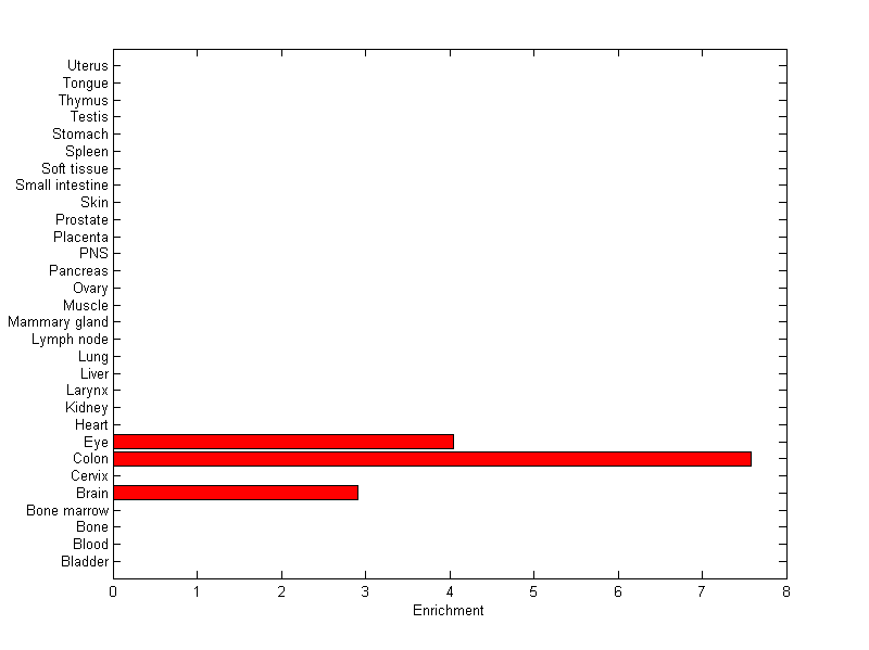 The expression level is normalized with tissue-library size. Each value for a gene in a tissue is a ratio of observed ESTs to the expected one in this tissue. The expected number of ESTs is the product of total ESTs of the gene and the fraction of total ESTs in the tissue among all ESTs in 30 tissues.