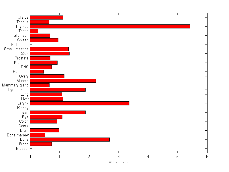 The expression level is normalized with tissue-library size. Each value for a gene in a tissue is a ratio of observed ESTs to the expected one in this tissue. The expected number of ESTs is the product of total ESTs of the gene and the fraction of total ESTs in the tissue among all ESTs in 30 tissues.