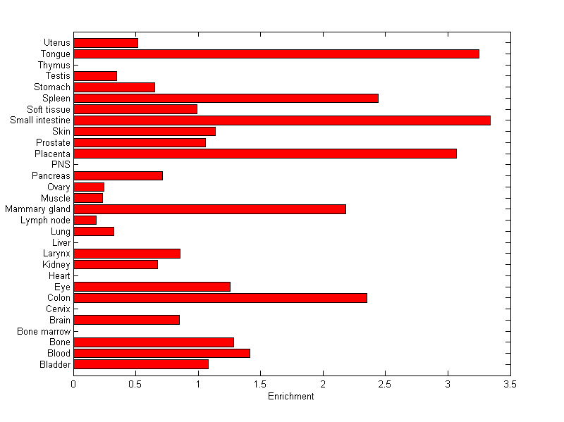 The expression level is normalized with tissue-library size. Each value for a gene in a tissue is a ratio of observed ESTs to the expected one in this tissue. The expected number of ESTs is the product of total ESTs of the gene and the fraction of total ESTs in the tissue among all ESTs in 30 tissues.