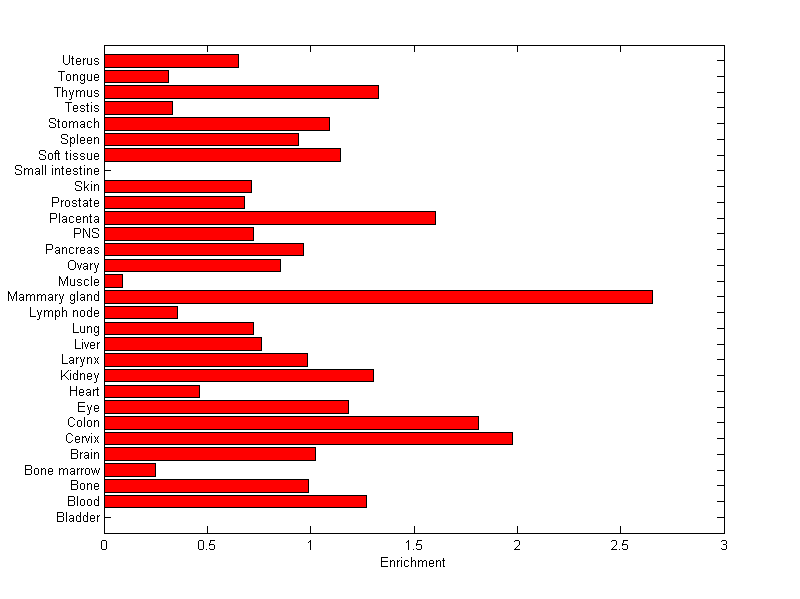 The expression level is normalized with tissue-library size. Each value for a gene in a tissue is a ratio of observed ESTs to the expected one in this tissue. The expected number of ESTs is the product of total ESTs of the gene and the fraction of total ESTs in the tissue among all ESTs in 30 tissues.