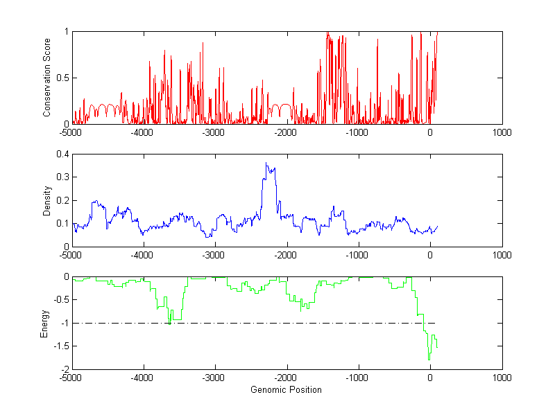 The energy profile (green curve) is about energy for module detection based on TF interaction. The positions with energy less than -1 indicate the existence of CRMs.