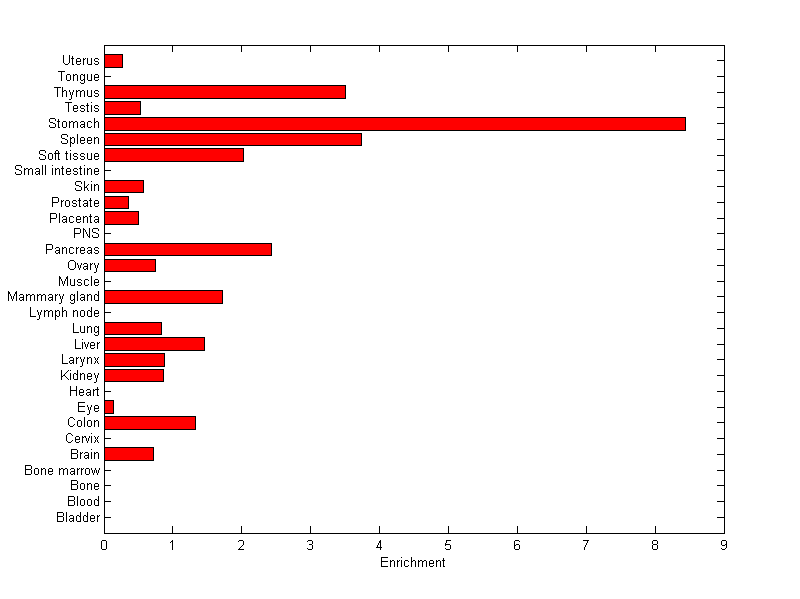 The expression level is normalized with tissue-library size. Each value for a gene in a tissue is a ratio of observed ESTs to the expected one in this tissue. The expected number of ESTs is the product of total ESTs of the gene and the fraction of total ESTs in the tissue among all ESTs in 30 tissues.