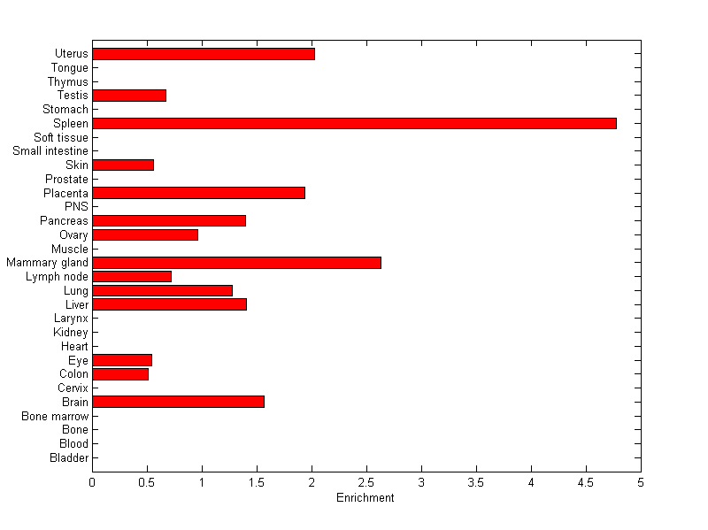 The expression level is normalized with tissue-library size. Each value for a gene in a tissue is a ratio of observed ESTs to the expected one in this tissue. The expected number of ESTs is the product of total ESTs of the gene and the fraction of total ESTs in the tissue among all ESTs in 30 tissues.