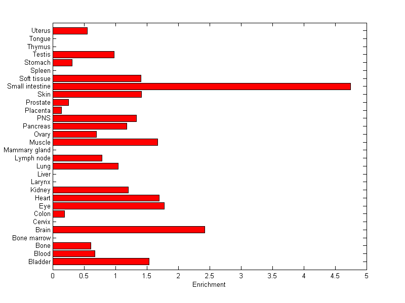 The expression level is normalized with tissue-library size. Each value for a gene in a tissue is a ratio of observed ESTs to the expected one in this tissue. The expected number of ESTs is the product of total ESTs of the gene and the fraction of total ESTs in the tissue among all ESTs in 30 tissues.