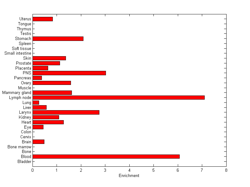 About the profile: The expression level is normalized with tissue-library size. Each value for a gene in a tissue is a ratio of observed ESTs to the expected one in this tissue. The expected number of ESTs is the product of total ESTs of the gene and the fraction of total ESTs in the tissue among all ESTs in 30 tissues. Summary: This gene is preferentially expressed in [lymph_node] Download: |