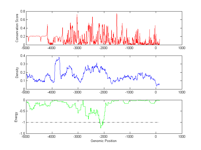 The energy profile (green curve) is about energy for module detection based on TF interaction. The positions with energy less than -1 indicate the existence of CRMs.