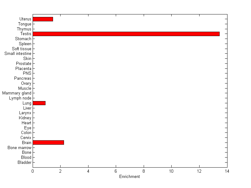 The expression level is normalized with tissue-library size. Each value for a gene in a tissue is a ratio of observed ESTs to the expected one in this tissue. The expected number of ESTs is the product of total ESTs of the gene and the fraction of total ESTs in the tissue among all ESTs in 30 tissues.