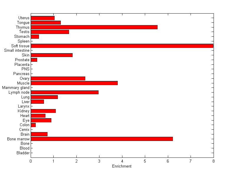 The expression level is normalized with tissue-library size. Each value for a gene in a tissue is a ratio of observed ESTs to the expected one in this tissue. The expected number of ESTs is the product of total ESTs of the gene and the fraction of total ESTs in the tissue among all ESTs in 30 tissues.