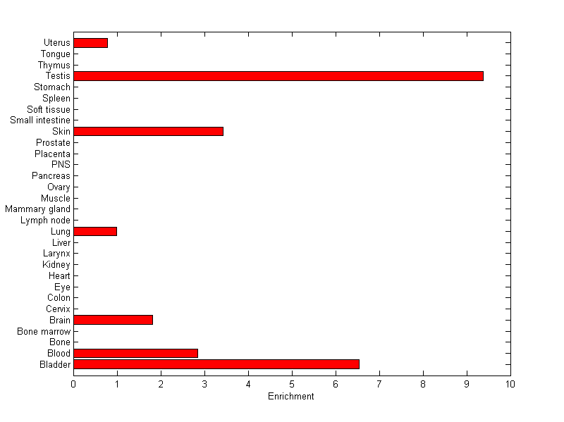 The expression level is normalized with tissue-library size. Each value for a gene in a tissue is a ratio of observed ESTs to the expected one in this tissue. The expected number of ESTs is the product of total ESTs of the gene and the fraction of total ESTs in the tissue among all ESTs in 30 tissues.