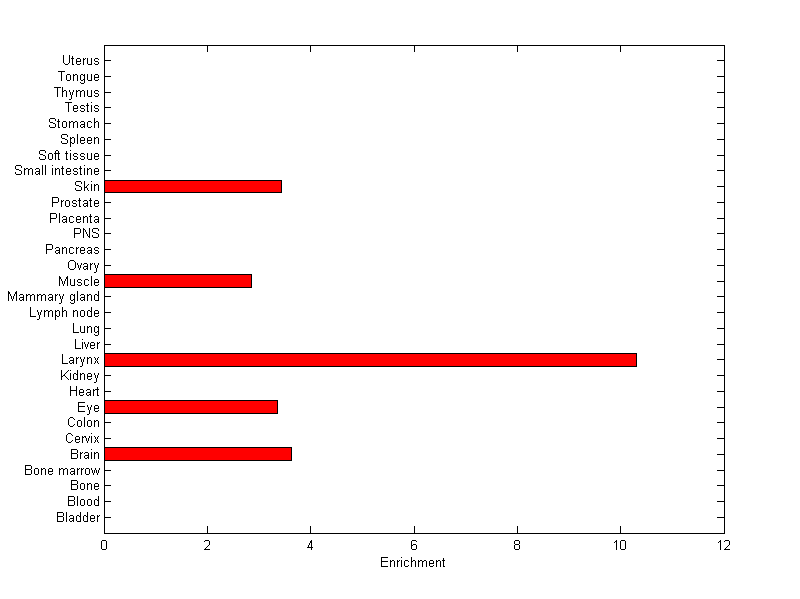 The expression level is normalized with tissue-library size. Each value for a gene in a tissue is a ratio of observed ESTs to the expected one in this tissue. The expected number of ESTs is the product of total ESTs of the gene and the fraction of total ESTs in the tissue among all ESTs in 30 tissues.