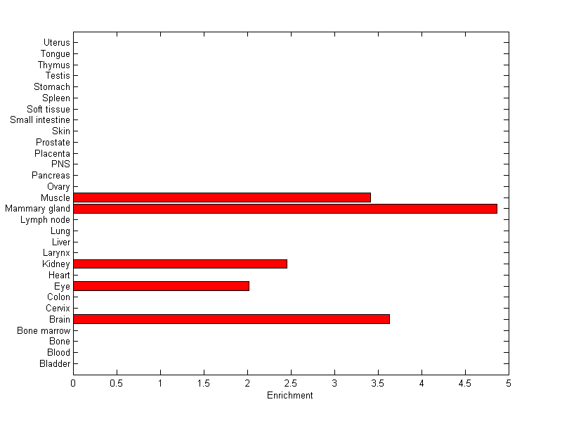 The expression level is normalized with tissue-library size. Each value for a gene in a tissue is a ratio of observed ESTs to the expected one in this tissue. The expected number of ESTs is the product of total ESTs of the gene and the fraction of total ESTs in the tissue among all ESTs in 30 tissues.