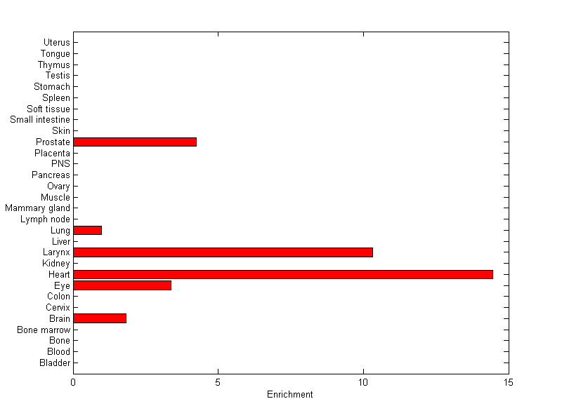 The expression level is normalized with tissue-library size. Each value for a gene in a tissue is a ratio of observed ESTs to the expected one in this tissue. The expected number of ESTs is the product of total ESTs of the gene and the fraction of total ESTs in the tissue among all ESTs in 30 tissues.
