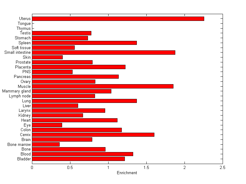 The expression level is normalized with tissue-library size. Each value for a gene in a tissue is a ratio of observed ESTs to the expected one in this tissue. The expected number of ESTs is the product of total ESTs of the gene and the fraction of total ESTs in the tissue among all ESTs in 30 tissues.