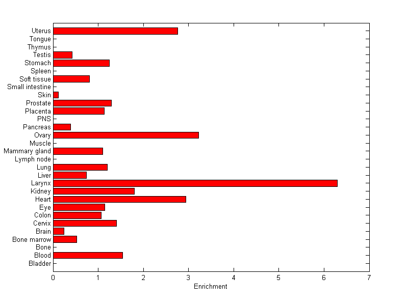 The expression level is normalized with tissue-library size. Each value for a gene in a tissue is a ratio of observed ESTs to the expected one in this tissue. The expected number of ESTs is the product of total ESTs of the gene and the fraction of total ESTs in the tissue among all ESTs in 30 tissues.