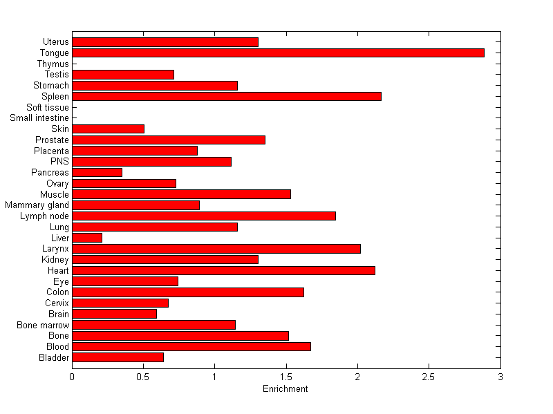 The expression level is normalized with tissue-library size. Each value for a gene in a tissue is a ratio of observed ESTs to the expected one in this tissue. The expected number of ESTs is the product of total ESTs of the gene and the fraction of total ESTs in the tissue among all ESTs in 30 tissues.