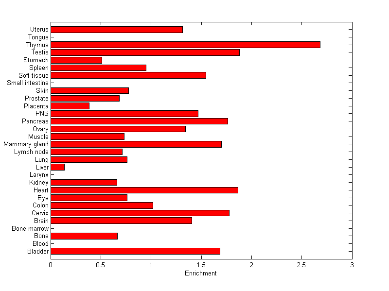 The expression level is normalized with tissue-library size. Each value for a gene in a tissue is a ratio of observed ESTs to the expected one in this tissue. The expected number of ESTs is the product of total ESTs of the gene and the fraction of total ESTs in the tissue among all ESTs in 30 tissues.
