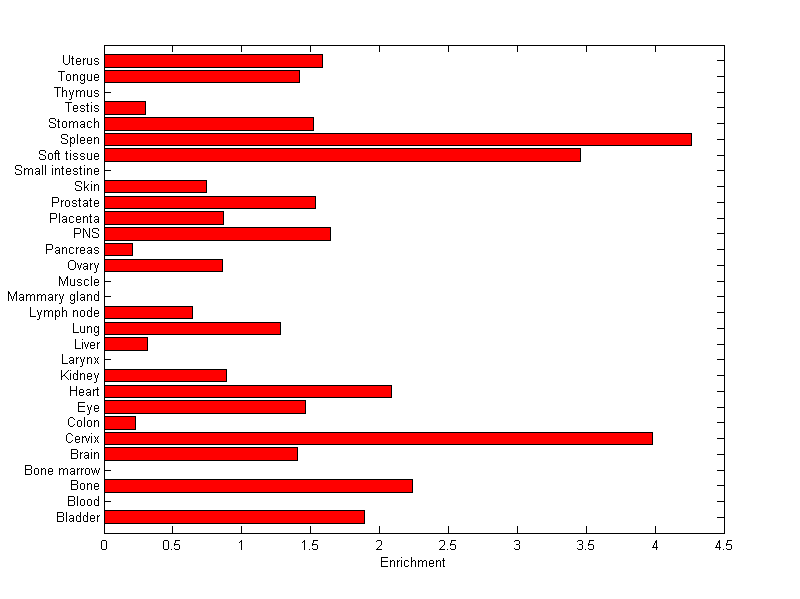The expression level is normalized with tissue-library size. Each value for a gene in a tissue is a ratio of observed ESTs to the expected one in this tissue. The expected number of ESTs is the product of total ESTs of the gene and the fraction of total ESTs in the tissue among all ESTs in 30 tissues.