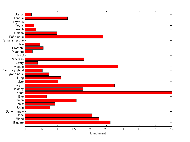 The expression level is normalized with tissue-library size. Each value for a gene in a tissue is a ratio of observed ESTs to the expected one in this tissue. The expected number of ESTs is the product of total ESTs of the gene and the fraction of total ESTs in the tissue among all ESTs in 30 tissues.
